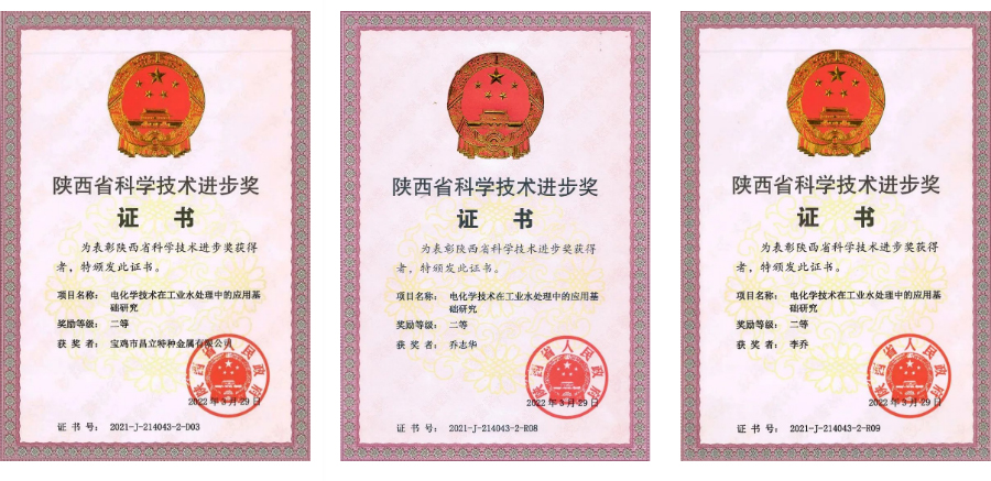 陜西省人民政府頒布《關(guān)于2021年度陜西省科學(xué)技術(shù)獎(jiǎng)勵(lì)的決定》,經(jīng)省科學(xué)技術(shù)獎(jiǎng)各專(zhuān)業(yè)評(píng)審組評(píng)審、省科學(xué)技術(shù)獎(jiǎng)勵(lì)委員會(huì)審定和省政府常務(wù)會(huì)議審議,由西安交通大學(xué)牽頭,寶雞市昌立特種金屬有限公司共同完成的《電化學(xué)技術(shù)在工業(yè)水處理中的應(yīng)用基礎(chǔ)研究》項(xiàng)目被授予“省科學(xué)技術(shù)進(jìn)步獎(jiǎng)”二等獎(jiǎng)。